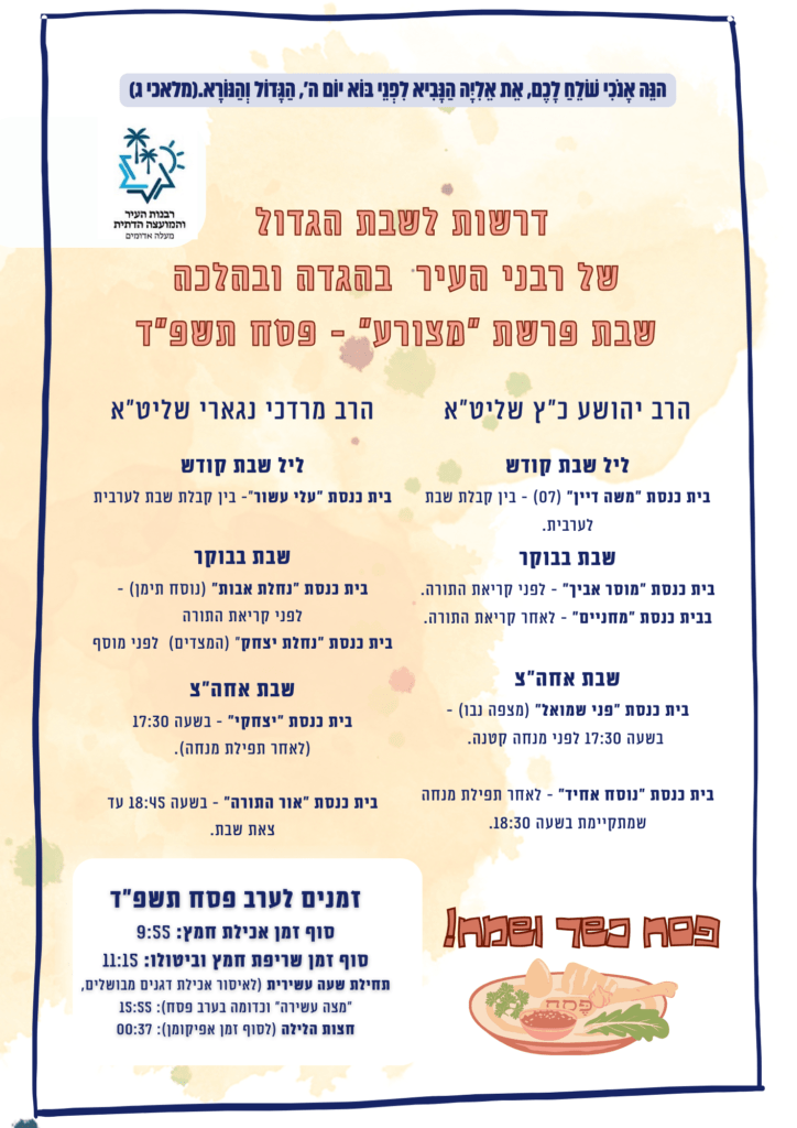 בבתי הכנסת בעיר וימסרו את דרשת "שבת הגדול" בהגדה ובהלכה לקראת חג הפסח.