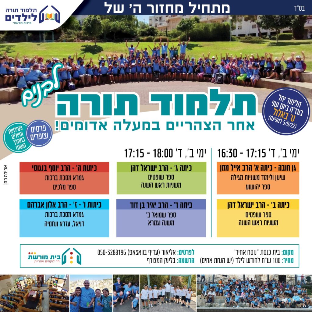 שלום לכל ההורים! התלמוד תורה של בית מורשת עף קדימה, ומתחילים עכשיו לימוד של ספר שמואל ומסכת פסחים, מוזמנים לצרף את הבנים שלכם ללימוד. כל הפרטים בפלאייר המצורף, ניתן לשלוח לשיעור נסיון כבר מחר. https://tak.co.il/new/?t=PO4 מצב קישור הרשמה🎊🎉
