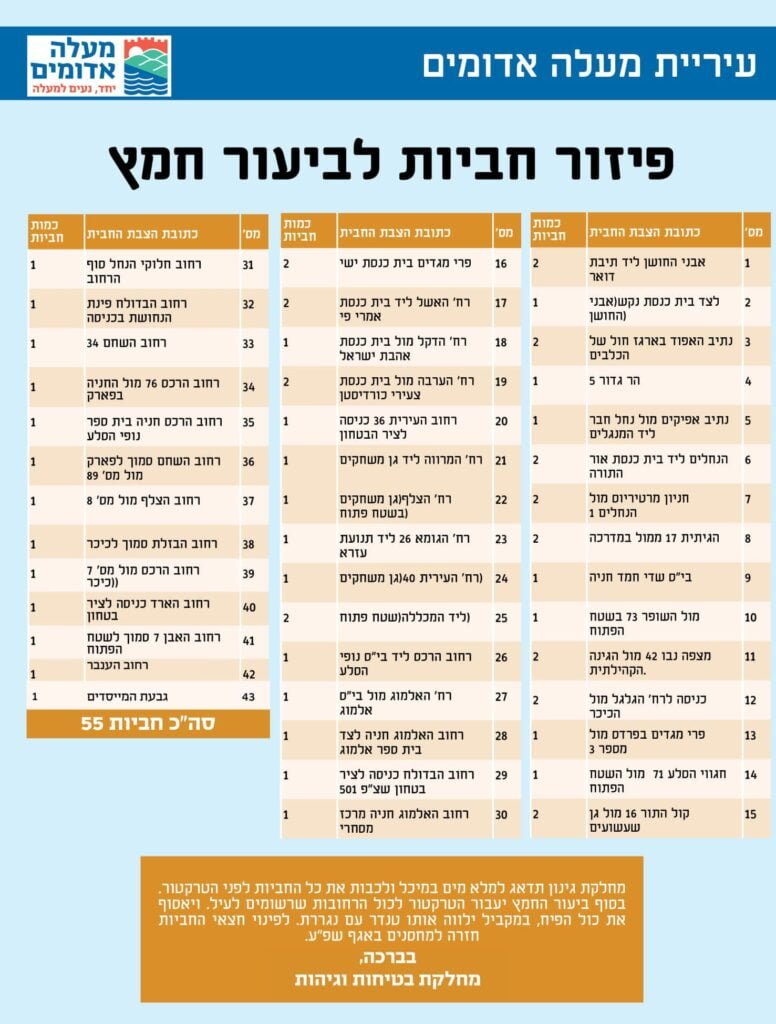 כמו כן, גבאים המעוניינים לקבל טפסי מכירת חמץ מודפסים כבעבר – מוזמנים להגיע השבוע בימים א'-ה' בין השעות 8:30 עד 15:30 לבניין המועצה הדתית רח' דרך מדבר יהודה 39.